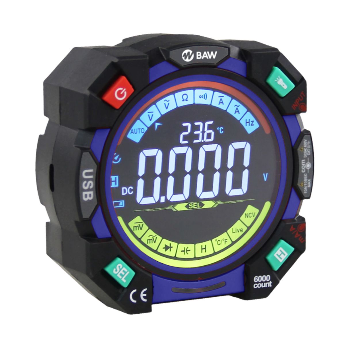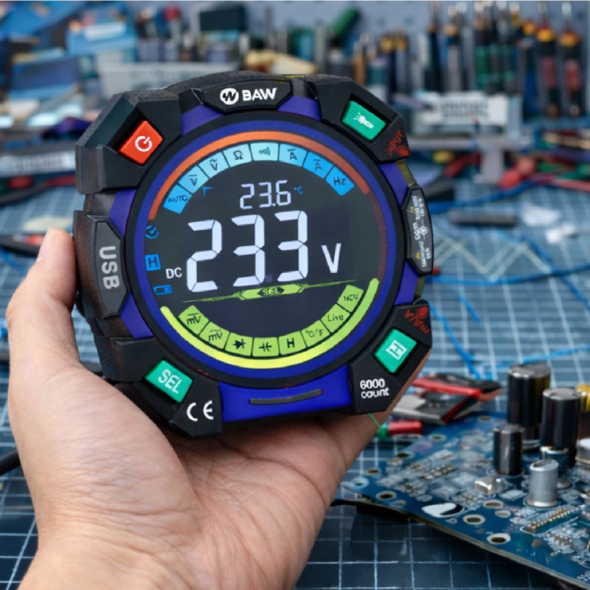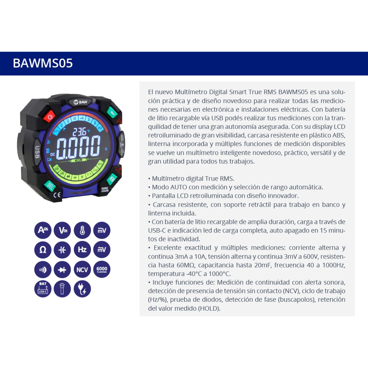 El multímetro digital Smart True RMS BAW MS05 es una herramienta moderna, práctica y versátil, ideal para electrónica, instalaciones eléctricas y trabajos de mantenimiento profesional. Su diseño innovador incorpora batería de litio recargable por USB-C, garantizando gran autonomía sin depender de pilas descartables. Cuenta con pantalla LCD retroiluminada de excelente visibilidad, carcasa resistente en plástico ABS, soporte trasero retráctil para trabajo en banco y linterna integrada, lo que lo convierte en un instrumento cómodo y confiable tanto en taller como en campo. Incluye modo AUTO con selección automática de rango, permitiendo mediciones rápidas y seguras. Gracias a su tecnología True RMS asegura lecturas precisas incluso en señales no sinusoidales.